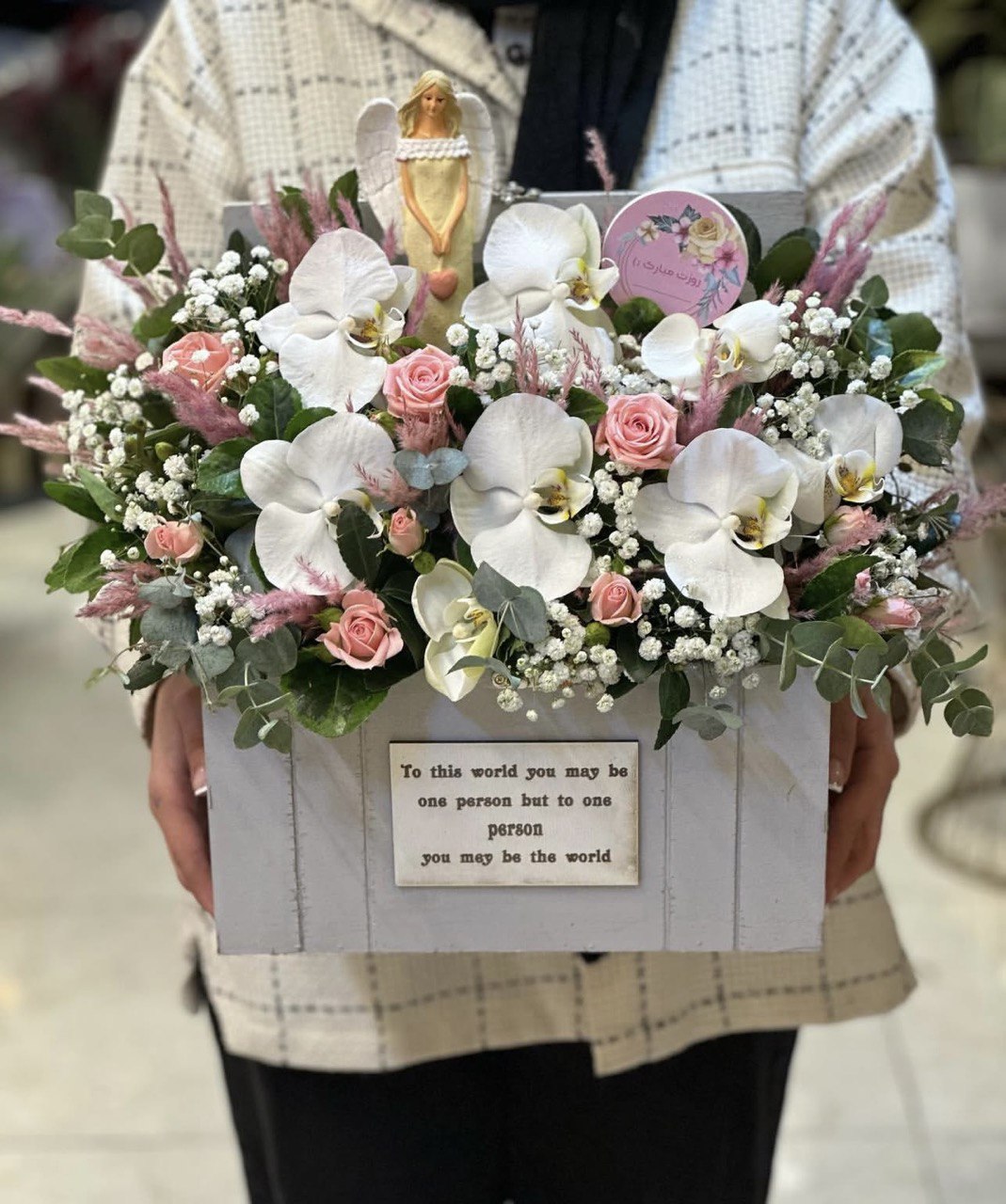 این باکس با استفاده از گل‌های تازه و باکیفیت تهیه شده و جلوه‌ای ماندگار و چشم‌نواز به فضای مورد نظر می‌بخشد.